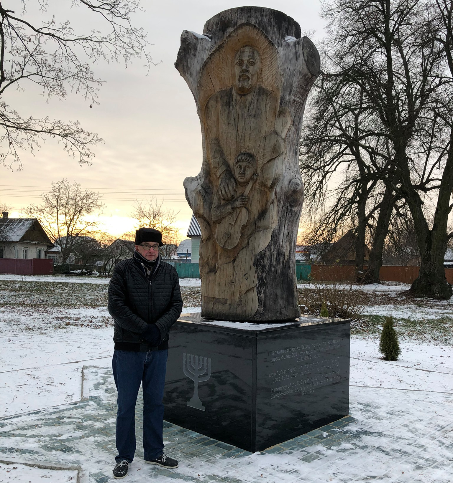 Ziv Begun standing next to the new granite and wood memorial sculpture in David-Horodok. Courtesy of Sinai Zilber.